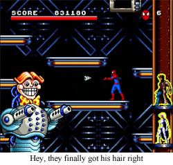 The final boss is a big robo clown that goes through a few different forms in a manner not unlike the final robo Burns fight of The Simpsons Arcade Game. Funny, that. Oddly, this boss battle is actually a lot easier than a lot of boss battles from earlier in the game (Juggernaut can cause a few headaches), and the X-Men imprisoned around the room actually aide Spider-Man in his otherwise solitary battle. Note to super villains, when you tie up the guy with eye lasers, who is named for the fact that he has eye lasers, maybe, just maybe, try to do something about hampering those eye lasers. Or not, it’s your choice. And after robo clown goes down, guess what’s next? That’s right! More robots! And they’re ridiculously easy and have no reason for existing because none of the robots turn out to be the real