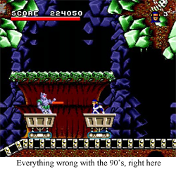 Gambit, the hard-drinking, hard-gambling, hard-rocking Cajun with a hard-on for Rogue, is separated from the object of his lust and thrown into an auto-scrolling hell. Being a master of kendo-style martial arts and various forms of unarmed combat, Gambit is naturally limited to finite ammunition in the form of a deck of cards, and, upon using up his deck, is left completely defenseless. Gambit, in the comics, once turned a wad of chewing gum into a lethal weapon, but now Acclaim says he’s as useful in a pinch as Dolphigan (the X-Men with the mutant power to arouse dolphins). The wildly defenseless scumbag is stuck outrunning either an auto-scrolling spiked ball or an auto-scrolling collapsing tower (I’m assuming that’s the premise of his second level, the danger is off-screen, as is the deal with most auto-scrolling levels, so it could be a giant mutant brine shrimp for all I know), and, in either situation, must avoid or attack various deadly chess pieces. It’s a well known piece of logic that dictates that someone who enjoys playing cards is afraid of chess. It makes perfect sense! It all makes perfect sense! And Gambit’s bosses are all playing card manifestations. PERFECT SENSE!