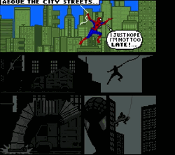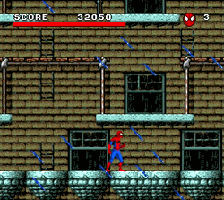 hop out of the water, and manifests her flying abilities in a really floaty jump. Of course, she’s still prone to falling in bottomless pits, so maybe her flying powers need a little more work. Maybe her costume is too wet? Maybe chere is thinking of Gambit, n’est pas? And at the end of each of these individual levels, each X-Man gets captured, again, while Spider-Man finally uses that super power of his I keep hearing about and saves his own hide for the final boss battle. Guess that’s why he got top billing.