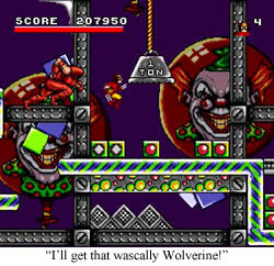 Wolverine must face circus midgets. He’s the best at what he does, and what he does is very colorful! He just runs around and tears clowns and toy soldiers to pieces. It’s probably not so much his worst nightmare as a cathartic little attack on Toys R Us. When Wolverine gets to take a break from the killer clowns, he takes out two big Marvel baddies, Apocalypse and Juggernaut. Apocalypse is a rather pathetic little boss battle where the ultimate mutant trades his demigod status for a Dhalsim impression, and Juggernaut is best defeated by dropping inappropriately placed anvils on the big lug’s head. I’m still trying to figure out how Acclaim turned a battle between two of the most serious, gritty mutants in all of X-Men into a Looney Tunes episode.