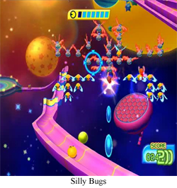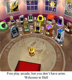 army of space bugs, but there’s a complete lack of spaceship navigation, so you’re playing House of the Dead, not Xevious. That said, this is the first game in the collection that really looks like someone took more than five minutes to design the environments and enemies, and the eclectic enemy formations make this all seem like a game you might actually want to pay money for. Granted, it would be a value somewhere between “cell phone download” and “xbox indie showcase”, but still a worthwhile game all the same. The only real sticking point is Pac-Man, who, once again, has been shoehorned into the proceedings with all the tact of a killer whale at a penguin convention, so he’s just a round, yellow target for the Galaga fleets. He’s not even the one shooting, so Galaga has effectively become an escort mission. I feel like I should deduct points for that.