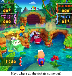 Gator Panic Remix is… just baffling. You’ve likely seen Gator Panic in an arcade somewhere, though it was probably an arcade at a boardwalk, casino, or theme park. It’s one of those games that wins you redeemable tickets based on your score, and I’m sure it’s a personal bias, but I’ve always been distrustful of such affairs, as I don’t play video games to score random knick knacks, I play video games to impress strangers on the internet with how many words I can ream out of Ice Climber for fun. Gator Panic, the arcade machine, is at least fun on its own, as walloping plastic gators with a bopper is usually a good time, and the gators make a very satisfying “ow” sound, assuming you can hear anything at your chosen venue. I never expected this game to be adapted for the couch, though, as the visceral gator whacking is such an integral part of the experience that just randomly aiming the wiimote is a pale imitation. An ideal game for venting frustration on reptiles becomes an extremely limited shooter/aiming game with Pac-Man’s inclusion, and, strangest of all, Pac-Man is being used as the bat. Someone at Namco decided to turn their beloved mascot into a bludgeon, and, shockingly, it wasn’t a good idea.
