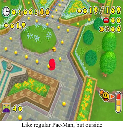 Finally, there’s Pac ‘n Roll Remix, which is the first time all day that Pac-Man feels even moderately like Pac-Man. Mazes are gone, and in their place is a vast, 3-D world with some unforgiving physics for the perfectly spherical Pac-Man. Basically, it’s Monkey Ball with a little more control, and more of an emphasis on “dodging”, as the ghosts have finally returned to ruin Pac’s day. This whole thing feels like a real, full game… because it is, as it’s simply an upscaled version of a DS game that came out two years prior. And, for reasons that are likely related to not giving a damn, they removed all the