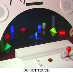 Hologram Time Traveler was a noble attempt to grasp one of those futures. The HTT arcade cabinet was a sight to behold: a short, fat machine that looked like something that could clean bowling balls squatted at a random corner of the arcade projecting a tiny digitized woman begging for rescue and quarters. Yes, HTT was one of the first games to use digitized actors to tell a story, and, more importantly, it projected the lil’ troop into holograms right there, with full voice acting and costumes appropriate for the time travel motif. Your hero was a cowboy, your princess was clad in space chic, and every time you died, there was some bonkers wizard waddling around and claiming to know what you did wrong.