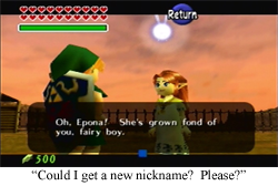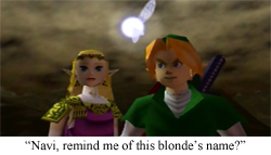 • Who is she?Maybe actually talk about the game for a second: Full disclosure? I didn’t like OoT the first time I played it, and I kinda still don’t. At the time, I just wanted Link to the Past/Link’s Awakening back, and now my issue with the game is more that it’s the least of all the 3-D Zeldas. That said, the “least” Zelda is still better than 99% of the games out there, and I tore through OoT 3D and its Master Quest in a series of days. Streamlining many of the game’s rougher edges makes all the difference.