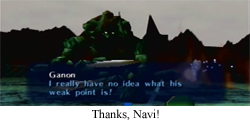 Link eventually gained a new friend in the form of Navi, a fairy that followed Link for precisely the length of his adventure. Navi is a peculiar Helpful as alwayscreature, capricious as fairies always are, but seemingly wholly focused on the mission assigned to her by the Deku Tree. Navi’s motivations are unclear throughout Link’s adventure: her dedication to him is unwavering while Ganondorf is afoot, but the moment that the danger is passed, she abandons Link with nary an explanation. Navi could likely provide the most insight into our hero’s state of mind and intentions, but, like the hero himself, her eventual fate is unknown. Given the near-mythical lifespans of fairies, it’s possible Navi is reading this even now, and, Navi, if you are, please find someone to tell your story. We’ll listen.