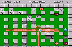 Unfortunately, there’s about five levels of gameplay in a fifty level game, and, man, it gets old fast. There is no level variety, whether it be aesthetically or gameplay-wise, and, should you want to see Bomberman complete his quest, you’ll be trudging through level after level of mediocrity. I’m not one for disparaging a game for being too long (after all, everyone has different needs for entertainment: nowadays, I love a game that’s over within a Saturday afternoon, but when I was in junior high, I would have killed for one of those modern 120 hour JRPGS… because I only got a new game once every few months, compared to my contemporary gaming gluttony) but this is the Hanukkah of the NES: there was only enough game for ten levels, max, but they made it last for fifty! Mazel tov! Considering this game was on the same system as NOT FUNDonkey Kong, I don’t think anyone would have complained about the ol’ “infinite loop with faster monsters” trick. Fifty levels of staring at the exact same thing… geez, it’s a wonder Bomberman isn’t burned into more ancient television screens.