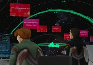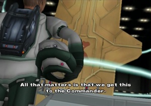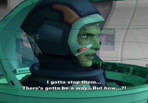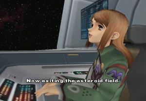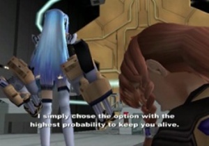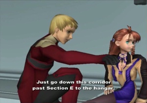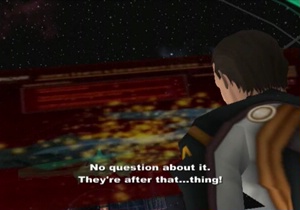 KOS-MOS is talking here, but she’s in the vacuum of space, so we can’t hear anything until the game decides to zoom in a little. Also, her space coffin pulls up alongside the escape pod like a loyal puppy.