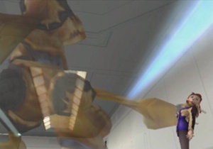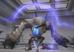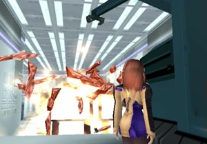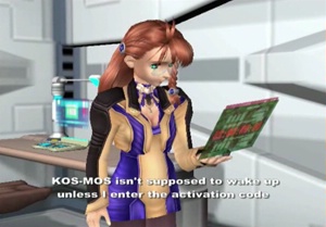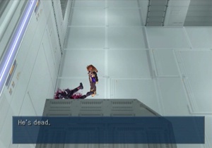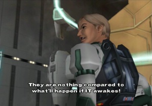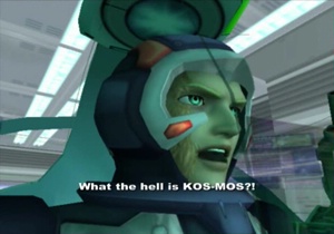Xenosaga, meanwhile, goes out of its way to establish why its heroes are the only ones for the job. This portion of the game is just Shion, average human and Vector scientist, and, despite having her arm thingy primed and ready to go, if she encounters even just one of these gnosis, she’s toast. Seriously, tap one of these guys wandering the halls, and you’ll be just as much of a red stain as that guy. Obviously, this won’t last, because this isn’t Metal Xenogears Solid, but it does provide a reasonable explanation for why the gnosis are a universal scourge, and why KOS-MOS, an anti-gnosis weapon, is so important to people outside of Shion’s monkeysphere. Remember, KOS-MOS is serial number 00-00-00-00-1. There are supposed to be more of her, and that’s exclusively to stop stuff like this from happening.