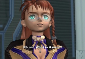 A cacophony of sirens raises our heroine. This is a weird kind of plot-fate thing. If KOS-MOS wasn’t having a freakout, Shion would not have been awakened, and she likely would have just died in her sleep in the next scene. This could be the first sign that KOS-MOS has an almost precognitive operating system. Or it’s just lazy writing.