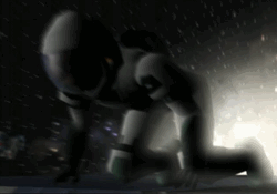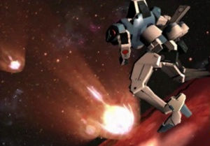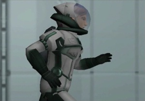 The escape pod seats two, so Cherenkov has to wear his spacesuit and hang on for dear life. KOS-MOS can’t do anything but look cool all the time, so she stands on the pod like she’s meant to be there.