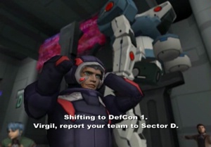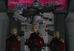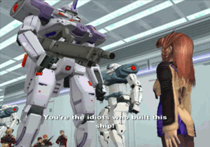 The Combat Realians (remember them? From Shion’s ethics debate?) all join the melee “naked”, that is, unlike the humans, they don’t hop into giant mechs. Virgil is impressed with their bravery.