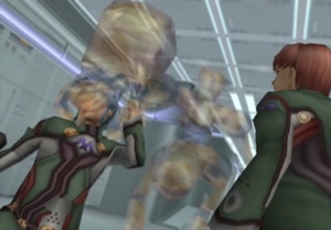 Now the gnosis are all solid and vulnerable, and KOS-MOS can wail on them at will. Anyone could get in on this action, but the whole crew decides to sit back and let the robot work. For science?