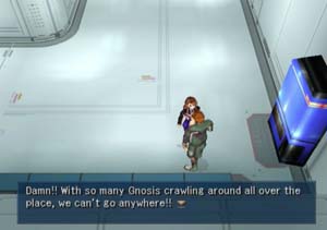 Back to the game, our first gnosis threat will chase Shion, but hustling over to the door button will save your bacon.