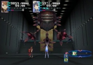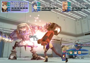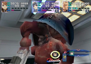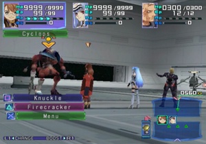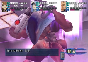 The main threat of Cyclops (that’s the name of this thing) is its Spread Beam, an ether attack that hits everyone. If you want, you can play this battle completely safe, and stick everyone but KOS-MOS in the back row. Virgil and Shion can heal KOS-MOS, and the multi-hit attack will only hit our blue-haired bot, but she can take it. Or you can say screw it and take a few lumps.