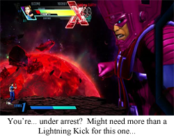 • What about One Player Mode: It’s a great way to practice against an AI opponent, and you do have to do it at least once to battle the one and only Galactus. It’s kind of amazing that this is the only game where I feel like his might was properly utilized (Marvel: Ultimate Alliance is second place… and then nothing). Galactus is a gigantic purple clad “man” in a skirt who wants to devour the Earth: how is he not the final boss of every Marvel game?