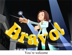 The kink to this game that separates it from every other rhythm game I can recall is that you are not playing an instrument, real or imaginary, this time. You are the conductor, so it’s your job to do that wavy hand thing that apparently serves some musical purpose. I would imagine this to be pretty difficult in reality (closest I’ve ever been to being a Hey babyconductor was some heavy flirting with a drum major… actually, two different drum majors on two different occasions. Maybe I have a type?), but during this game, you’re effectively just a rhythm section, forced to tap buttons along to the beat. It’s not that difficult, as I have enough rhythm to win the game, and I’m whiter than some wampas. I can’t imagine how well someone with a greater understanding of 3/4s time would do with this setup.