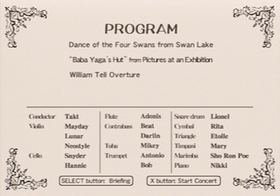 Mad Maestro doesn’t include any jumps or goombas, but it does offer the fairly unique opportunity to direct an orchestra. The story is mundane as far as plot-based rhythm games go (sorry, no repelling alien invaders through mariachi music here), you’re Takt, a young composer and conductor who is approached by a magical fairy (okay, maybe the plot is a little weird) with the mission of saving the local Concert Hall with a grand orchestra performance. On the way to the ostentatious performance, Takt recruits a number of townspeople (and a bear) (and some aliens) through playing classical music at random points throughout the city. Help a guy romance his girlfriend, and he joins you with a cello. It’s a pretty standard way to form a band. After ten stages of recruitment drives, it’s time for the really big show, and, assuming you’ve learned, like, something over the course of the entire game, you probably won’t be booed off stage.
