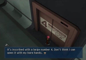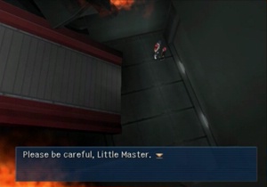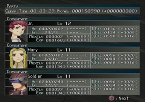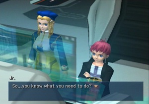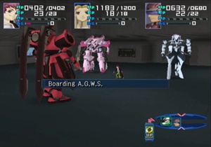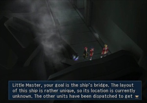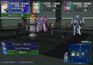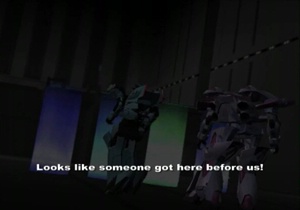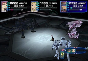 Back to the game, here’s our party. Junior is the only one that will be fighting sans AGWS, the other two will be permanently strapped into moderately-large robots. Props to Xenosaga, this is a rather clever way to introduce “disposable” characters. Vicks and Wedge would be proud.