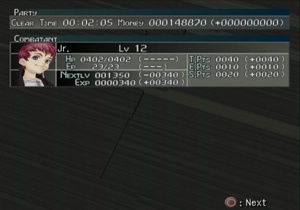 And that’s the last we’ll see of everybody but Junior (battle-wise, at least). It’s funny that everybody gains all the various Xenosaga Episode 1 battle points, as you’re not even allowed to enter Junior’s upgrade menu for this entire scenario, left alone the rest of the party.