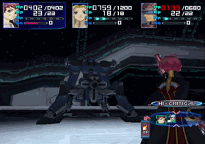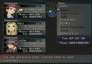 Oh, this is important. Like his AGWS, Junior attacks with guns. This means, unlike literally the entire rest of the cast, Junior always uses a long range attack. This is huge, because for everybody else, it’s either a close range physical attack, or a long range ether attack, and there are enemies that can only be hit with long range attacks. The designers, aggravatingly, seemed to exploit this by occasionally tossing in a long range monster that is only vulnerable to physical attacks, so, basically, Junior is the only way to go for a quick battle. This is annoying, as, in a game that is otherwise so good about giving you options to exploit enemy weaknesses, there are battles that are completely make or break according to whether or not you had the foresight to stick Junior in the frontlines.