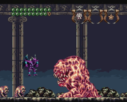 The gameplay has changed dramatically, too. Firebrand’s flight is now infinite, so, while there are still platforming “challenges”, an area early in the forest level seems to flaunt the fact that Firebrand can now lazily soar over any and all moving platforms. Later, Firebrand gains true flight with the Air Crest, and any vertical issues are completely circumvented. Perhaps to compensate, there is now a greater emphasis on the combat and bosses of each stage, so, rather than worrying about bottomless pits, Firebrand must now fret over life-sapping goo and skeleton cleavers. Of course, your main adversary is much more immediate…