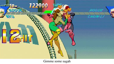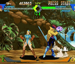 to use and who I want to be able to use. Rogue is awesome: I love her 90’s design, and, conceptually, I love her animations and special attacks that, really, boil down to “Superman that likes to punch things”. That said, I can barely win a match with her. On the other hand, I can somehow destroy everything with Dhalsim. Is he overpowered in this game? I’ve never been one for tiers, but it seems like he can zone like a champ in this one. - Z-Fighters: All winning X-Men get an “X” silhouette background, but Street Fighters get… a stylized Z? I suppose it’s a holdover from Street Fighter Alpha 2, but it’s surprising how that little detail has aged poorly alongside the perennial Street Fighters featured in this game (their 90’s designs are their designs).