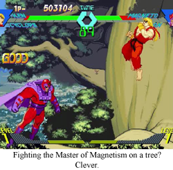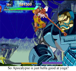 - Apocalypse Now: I want to say this is the first 2-D fighter I ever played to feature a gigantic, almost action-game-esque final boss. Apocalypse becomes screen filling in his final form, and he would eventually be followed by Onslaught, Abyss, and Galactus in other Vs. games. This was, incidentally, the best thing Onslaught ever did. Beyond that, it appears the Blazblue franchise and other “anime fighters” have picked up the tradition… which can be really confusing in an arcade mode that is over before you’ve even mastered your character’s super jump…