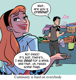 Oh? Batman? I wonder what he’s up to? He’s dead? He’s traveling through time? He’s Robin? He’s got old gloves? He’s a bunny robot now? That’s neat. I don’t have to enjoy the story, I don’t even have to understand it, all that matters is that that aggravating part of my brain that tracks my video game Sinestrobacklog and how many exs aren’t talking to me right now also has to know exactly what Spider-Man is doing right now, and God help us all if I don’t have a succinct reason for why Peter Parker is suddenly Tony Stark. And Tony Stark is seeing Mary Jane? Oh, that’s gonna need some ‘splainin’.