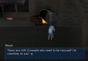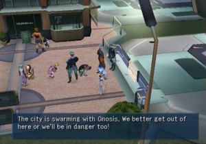 As you may expect, the streets are wrecked, and crawling with gnosis. Oddly, every area thus far has had very distinct “only appearing in this dungeon” gnosis, with only the occasional “cameo” of a gnosis from a different area. About 80% of the gnosis in this area, however, are all recycled from the previous update’s virtual Miltia. I don’t know if this is meant to indicate that “old” Miltia and current Kukai Foundation are under attack by the same gnosis fleet/weapon (which is accurate), or if the designers just got lazy, or perhaps this dungeon was a late addition, and there wasn’t any time to make that many new gnosis.