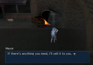 Alright, here we are in town, the actual “dungeon” of the day. The Mayor (who we somehow missed on our other trips through town) will sell you anything you need. Convenient that he’s carrying around a cache of guns and cyborg weapons!