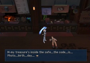 This guy… doesn’t count. The inn’s owner wants you to retrieve his “treasure” from the vault you weren’t allowed to access earlier. Rather than just telling you the combination, though, he dispenses a fairly imprecise clue. Thanks, dead guy!