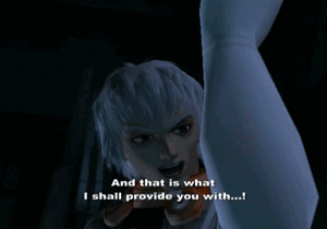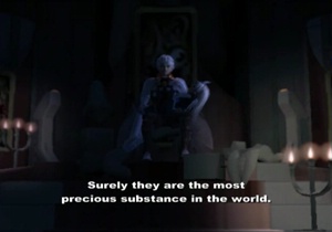 He tosses the poor girl aside, and starts ranting about “the song” again. Remember, that was lil’ Albedo’s shtick, too. Some people never grow up…