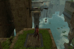 broken knees and shattered spines. Running along walls, vaulting up flagpoles, and then leaping across rooftops is exhilarating and fun, but there’s nothing there if it’s all on auto-pilot and you’re invincible all the while. Conversely, if everything is too difficult, you’re trapped watching the creation of a gnarled pile of bones over and over again, which then leads to replaying the same stupid challenges over and over again. Exhilarating and fun becomes trite and boring after doing the exact same thing three times or so, and, well, Mario is right over there, doing exciting stuff and never complaining about his ankles being driven through his hat. But The Sands of Time’s brilliant change to the formula was that Prince can rewind time, and thus walk back any fatal missteps. As long as you’ve got some time sand in your dagger, you can outrun death, and avoid monotonous gameplay repetition.