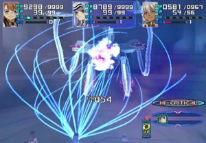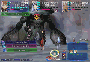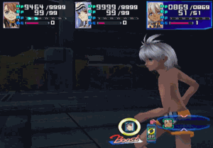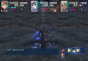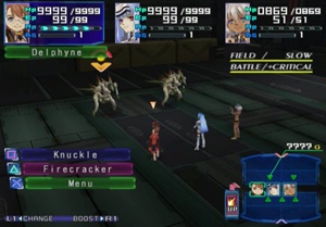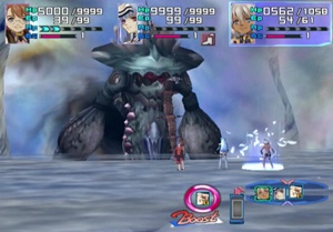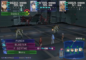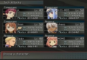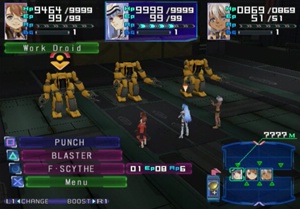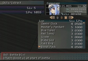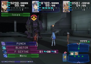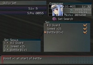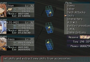 Having three accessory abilities can make a huge difference. So, for instance, I’ve outfitted KOS-MOS with KO Guard, Speed + 25% (which, in Xenosaga’s battle system, means she’ll be attacking a whole lot more), and “Battle BC+1”, which means she’ll start every battle with an extra boost level. I’ll explain why that’s awesome in a moment.