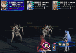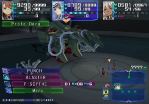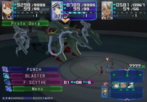 One blast from KOS-MOS, and Proto Dora joins them. I do not like to be ambushed by minibosses well past save points!