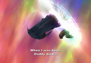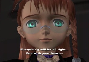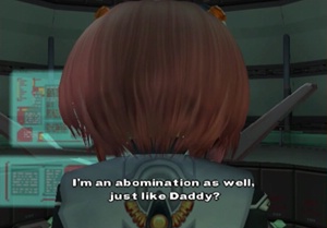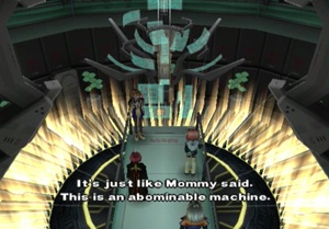 THIS IS IMPORTANT. Okay, one, obviously, this cheers MOMO up. But, two, SUBTEXT: this is Shion coming to terms with the prophecy back at the Virtual World. Remember, she saw that KOS-MOS was capable of destroying a planet, and she’s been carrying around that burden ever since. Here, Shion has something kind to say to MOMO, but it’s also her coming to the realization that she, KOS-MOS’s fake mom, cares about her daughter too much to ever consider her a deathbot. In a way, this is a resolution going all the way back to Virgil’s death: Shion is concerned about daughter droid growing up to be a remorseless killing machine, and that’s never going to go away, but it’s here that Shion acknowledges, no matter what happens, KOS-MOS will always be important to her, and she’ll stand by her, no matter what.