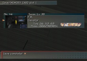 Bottom floor, everybody off. Note that it’s probably a good (and unintuitive) idea to double back up that elevator and hit the save point again. If you wipe on the final boss, you’ll have to fight those mandatory elevator battles again if you didn’t think to save that you once won… and it’s always a good idea to use a tent.