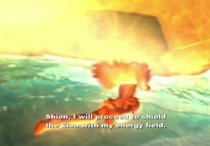 Oh, alright. I guess she’s using her KOS-MOS energy shield that has never been seen before this moment to save the ship.