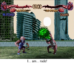 Chaos (not chaos) is a giant ape who coincidentally looks just like Blizzard, except Chaos is red and Blizzard is blue. Really, who needs extra character models when you’re doing alright with just five? Chaos is based on every seven year old you’ve ever met, so he flails, farts, and pukes to victory. And if that isn’t bad enough, he has one fatality where he vomits into his own mouth, and another (which is censored in the SNES version) where acidic pee is involved. Kids love dinosaurs and farting, why didn’t this game do better?