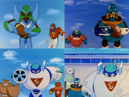 After the melee subsided (the Dive Men were able to run off in the confusion), I realized that Baseball is not the sport for bots programmed to fire a variety of projectiles. I still like the idea of a sports team of Robot Masters, but… Hm.