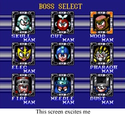 • Favorite Robot Master (this game): Wily, look at all your Robot Masters. Which would be great at soccer? Shadow Man? No. Quick Man? Nah. Toad Man? Yeah, that one, let’s watch him wobble around the field.