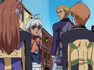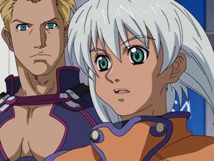 So far, our heroine has been saved by two separate Realians, and now we have the “Virgil accidently shoots at Shion” scene… but there isn’t the coda of Shion brushing the guns aside and yelling at the twit.