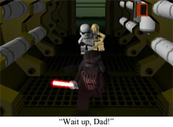 Weesa gonna dieLSWTVG has ridiculously simple, “easy” gameplay. For instance, you can’t die. Well, you can “die”, but you respawn immediately, and the only consequence is losing a few studs (basically points). The gameplay is essentially closest to being a beat ‘em up, but there are no combos or complicated button presses. Just jump, attack, and “special”. Special, at least, is where the game shines. In order to make the huge cast more distinctive, every character gets a unique action to their class, like Jedi can use the Force to shove blocks around, or gungans can inexplicably jump high. Some of the classes seem like a stretch (blaster characters, like Amidala, get grappling hooks, and “small” characters like Anakin can fit into tight passageways), and, if you think about it, the Force users should have all abilities (Qui Gon can jump higher than Jar Jar and you know it!), but it all blends into a fun reason to switch around between Star Stars. Maybe “beat ‘em up” is the wrong genre… puzzle platformer? Is “remember which character is a Jedi” a puzzle? Is it still a puzzle game if the puzzles are for kindergarteners?