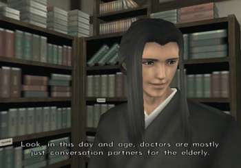 Ladies and gentlemen, here is the one JRPG in history that acknowledges that when your party can toss around healing “spells” and “potions” willy nilly, doctors instantly become obsolete. As Jin literally states here, doctors are now pretty much just counselors, and all actual illness or injury is solved with nanites. Xenosaga has thought one part of its universe completely through.