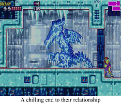 • Powerup: I really like the way the X-Parasites make health/missile powerups practically mandatory drops, and that Samus may have to “chase” said RIDLEY!drops for acquisition. It’s an additional gameplay quirk that you’d think you’d see more often in 2-D.