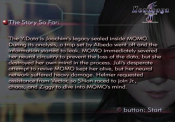 Actually, come to think of it, Xenosaga Episode 2 itself provides a “The Story So Far” screen every time you boot up the game. If I were cool enough to coordinate my saves with my post breaks, I could just use these silly things every time.