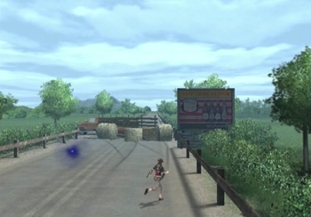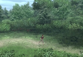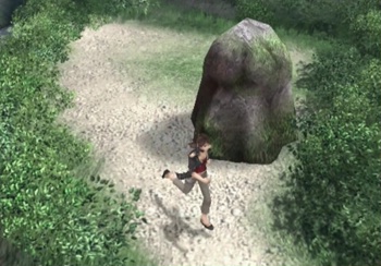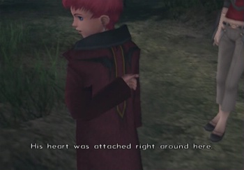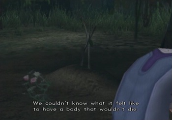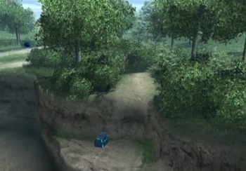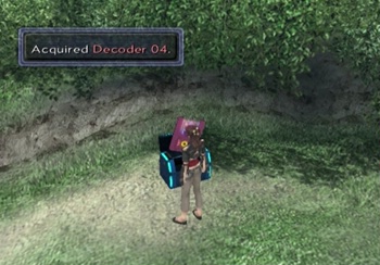 Back in the bad log neighborhood, there’s a secret path through the foliage that leads to a treasure chest. Amusingly, no one made “jumping” animations for Xenosaga Episode 2, so every time your character “jumps down” the cliff, the screen just fades out and back in.