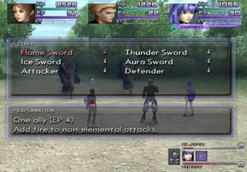 Speaking of elemental attacks, you should start using the elemental sword ethers around now. This is your typical “mystic knight” buff, and allows you to add an element to any character’s physical attacks. Given many, many monsters are specifically weak to particular elements, this can cut down battle time dramatically (and gives your physical-based heroes an excuse to use their EP pools, too). Added bonus: if a monster is weak to an element, and everyone hits that weakness, you get a damage multiplier for stacking on the pain.