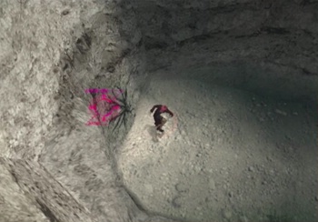 Continuing on a little, there’s this suspicious rock wall, but we’re not allowed to blast it from this direction for completely arbitrary reasons.